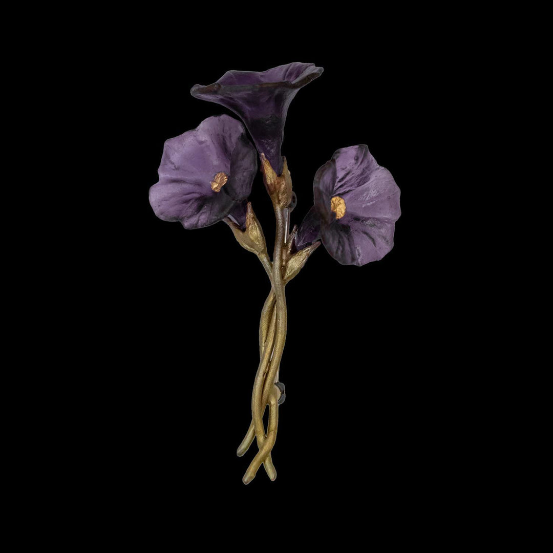 Jede Blüte der Kollektion ist aus farbigem Glas modelliert – in einem tiefen Violett, das an die satten Töne der echten Petunie erinnert. Feine Blätter und Zweige aus handpatinierter Bronze unterstreichen die botanische Herkunft der Designs. Das Zusammenspiel aus Farbe, Form und Struktur macht jedes Stück zu einem kleinen Kunstwerk der Natur – ausdrucksstark, aber nie aufdringlich.