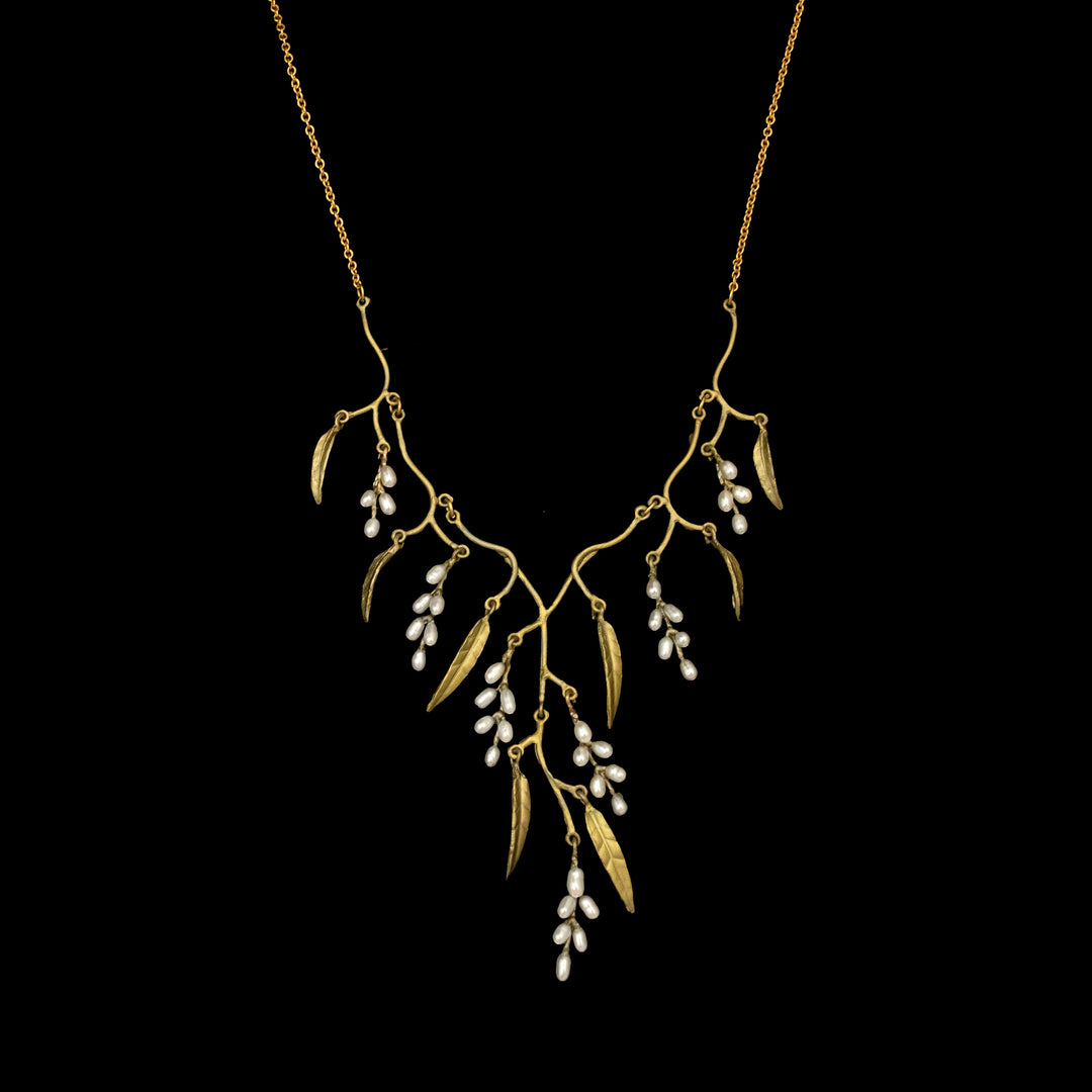 Inspiriert von der natürlichen Silhouette des Baumes, vereint die Kollektion feine, handpatinierte Bronze mit weißen Süßwasser-Saatperlen. Die Kombination aus mattgrüner Oberfläche und schimmerndem Perlmutt spiegelt die Leichtigkeit und Vielschichtigkeit der Pflanze wider. Jedes Blatt, jede Linie ist sorgfältig modelliert, um die fließende Bewegung der Weide naturgetreu einzufangen – ein Schmuckstück mit Tiefe und Seele.