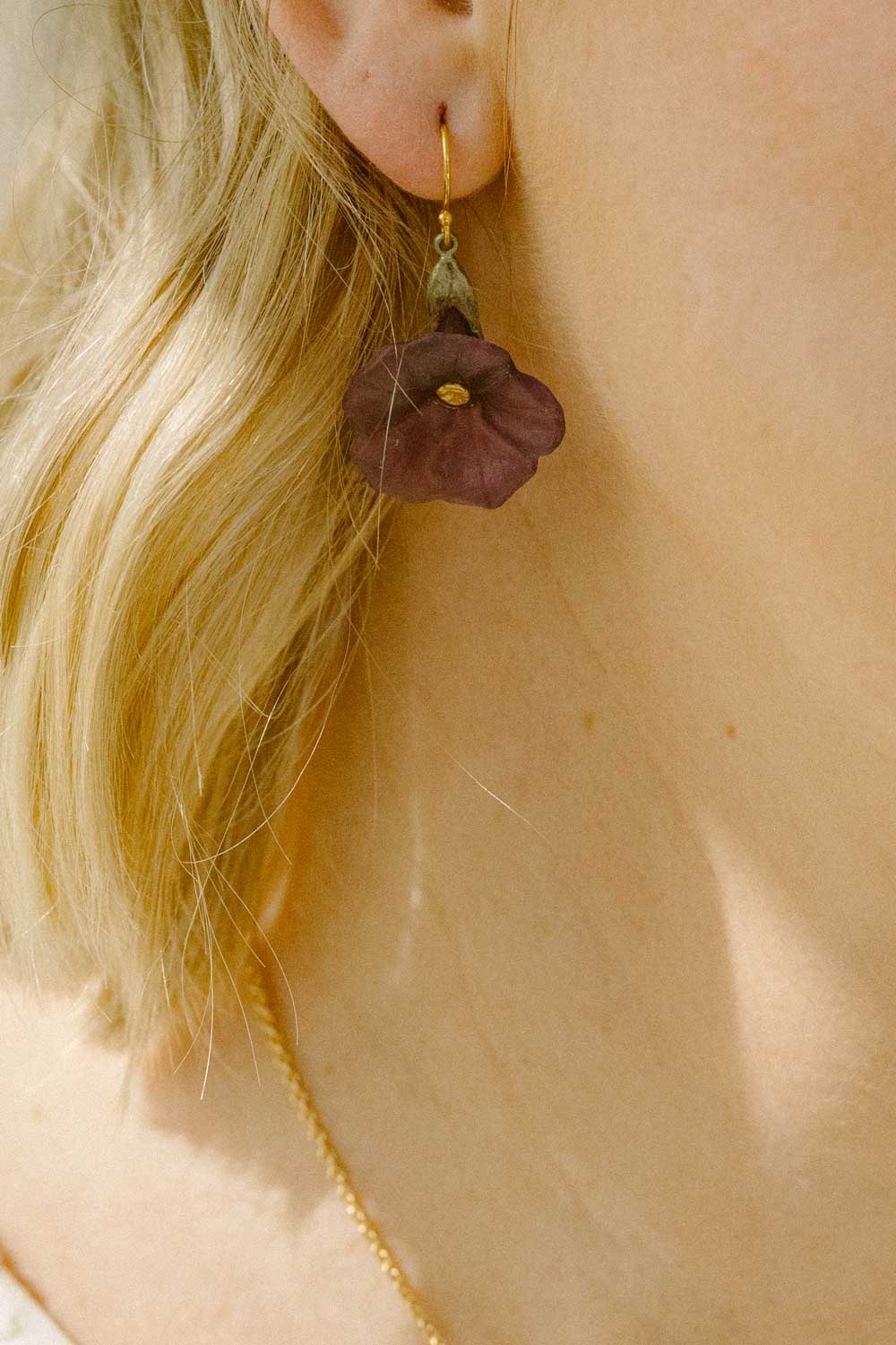 Die Petunie zählt zu den Lieblingsblumen vieler – bunt, lebendig und voller Charme. Diese Ohrhänger feiern genau diese natürliche Schönheit: Die tiefvioletten Glasblüten strahlen in kräftigem Ton, während feine, handpatinierte Bronzeranken die organische Form der Pflanze zitieren. Zusammen entsteht ein Schmuckstück, das Naturpoesie und edles Design verbindet.